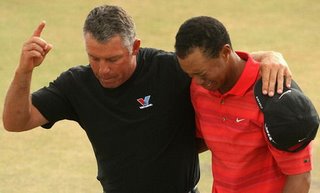 In the Conditions section on the entry form for the Open, it states that caddies must wear the Open Championship bib during all practice rounds and the championship. It also states that players are responsible for the conduct of their caddies as well as their adherence to the conditions. Steve Williams removed his bib on the 18th hole before play was concluded. On the 18th hole! Of course Tiger and Steve had gaggles of cameras on them for the whole tournament, but the most visible spot and seen by more people than anything is the 18th green and the winner. People who don’t watch or care to watch golf will see it in the newspapers and on TV without trying. And Steve wasn’t in the correct attire.